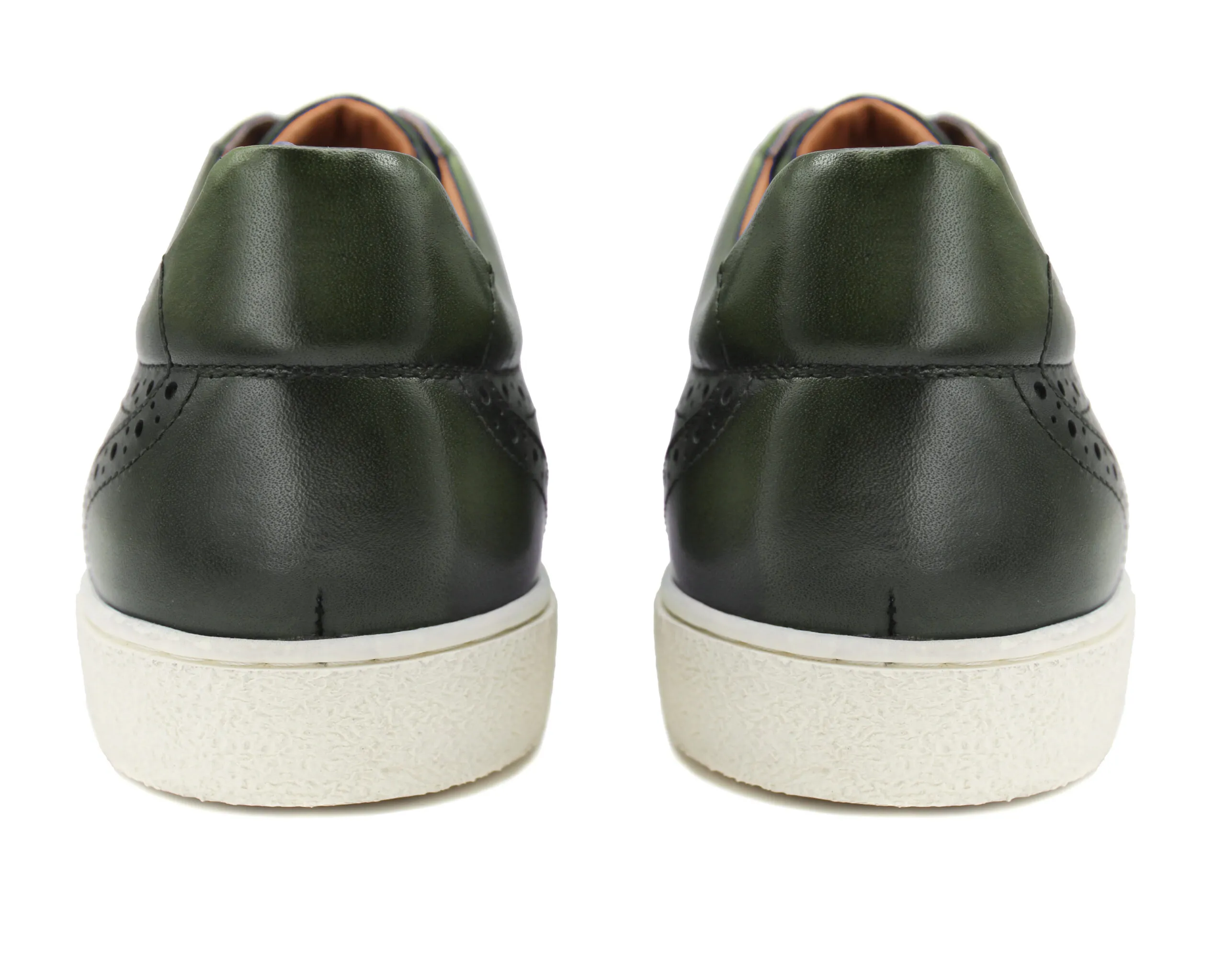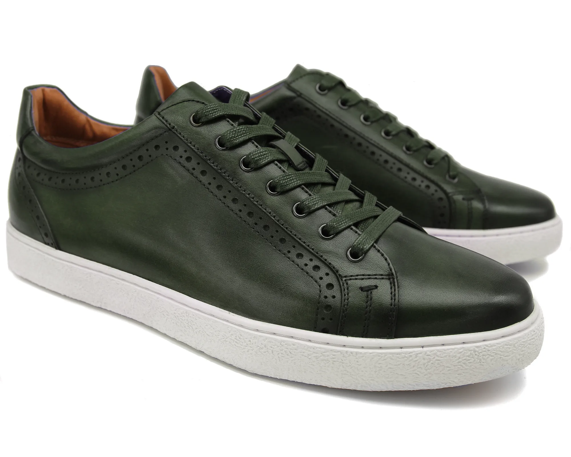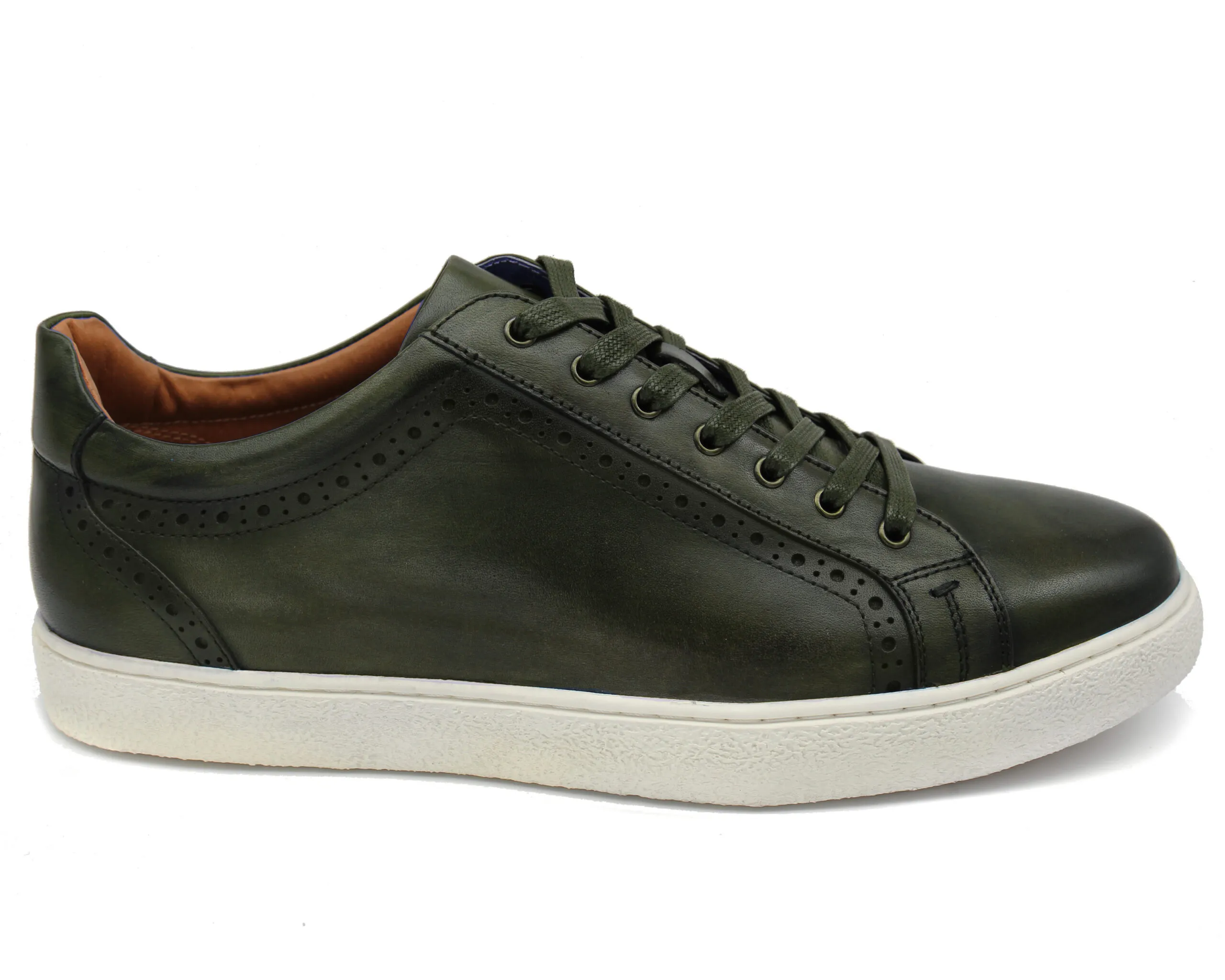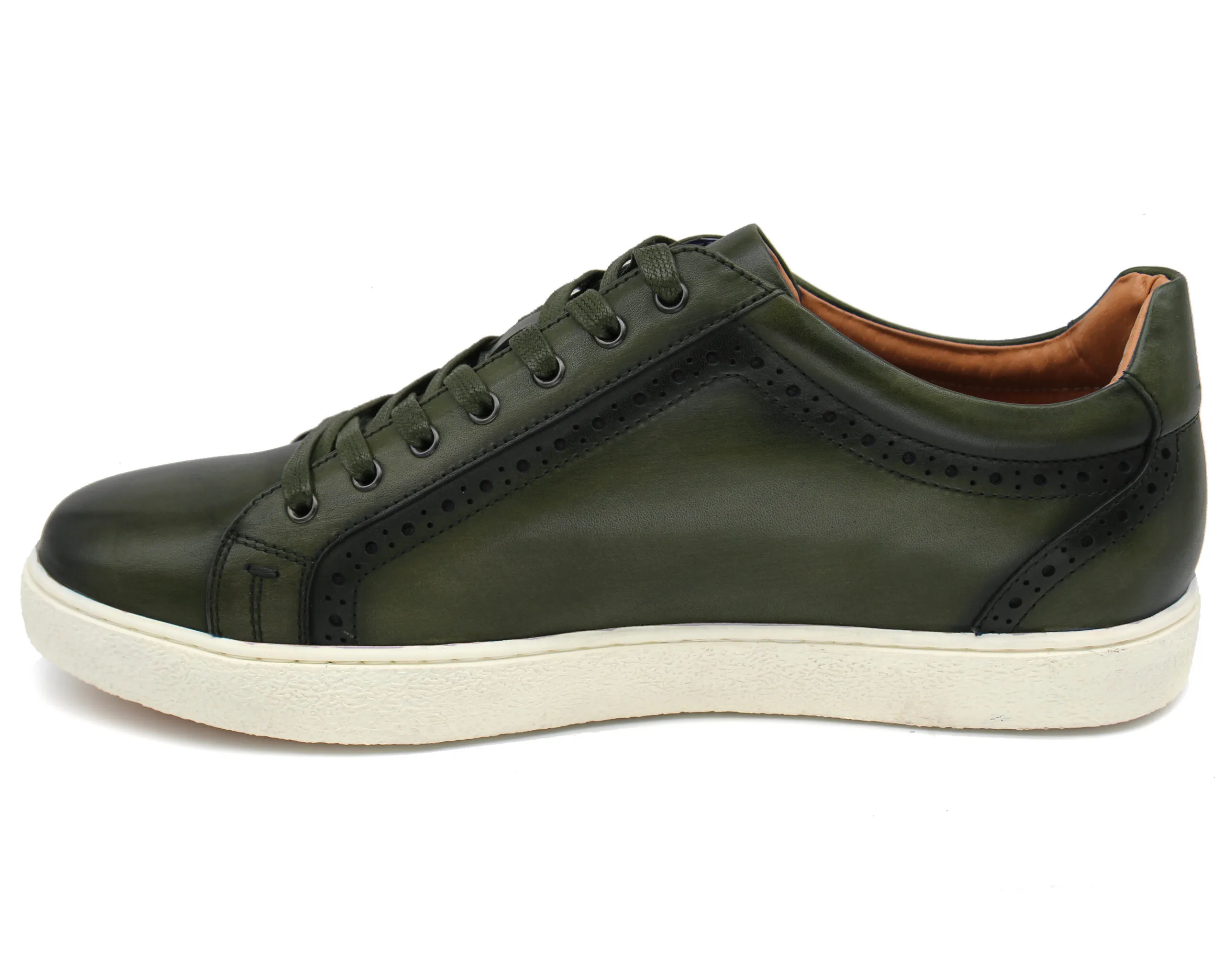 Green smooth leather lace up sneakers with antique finish. Genuine leather upper. Chunky white sole. Leather lining.
