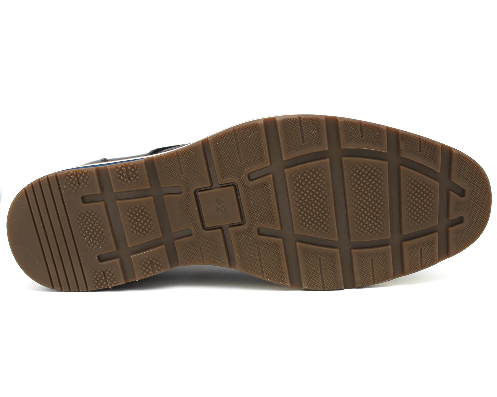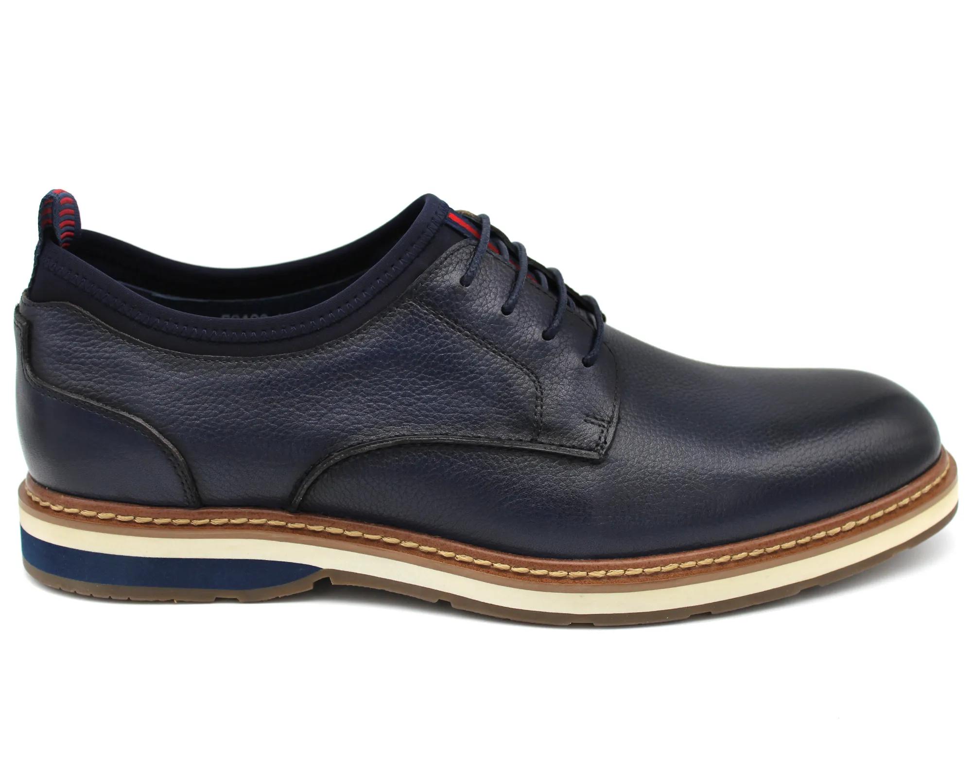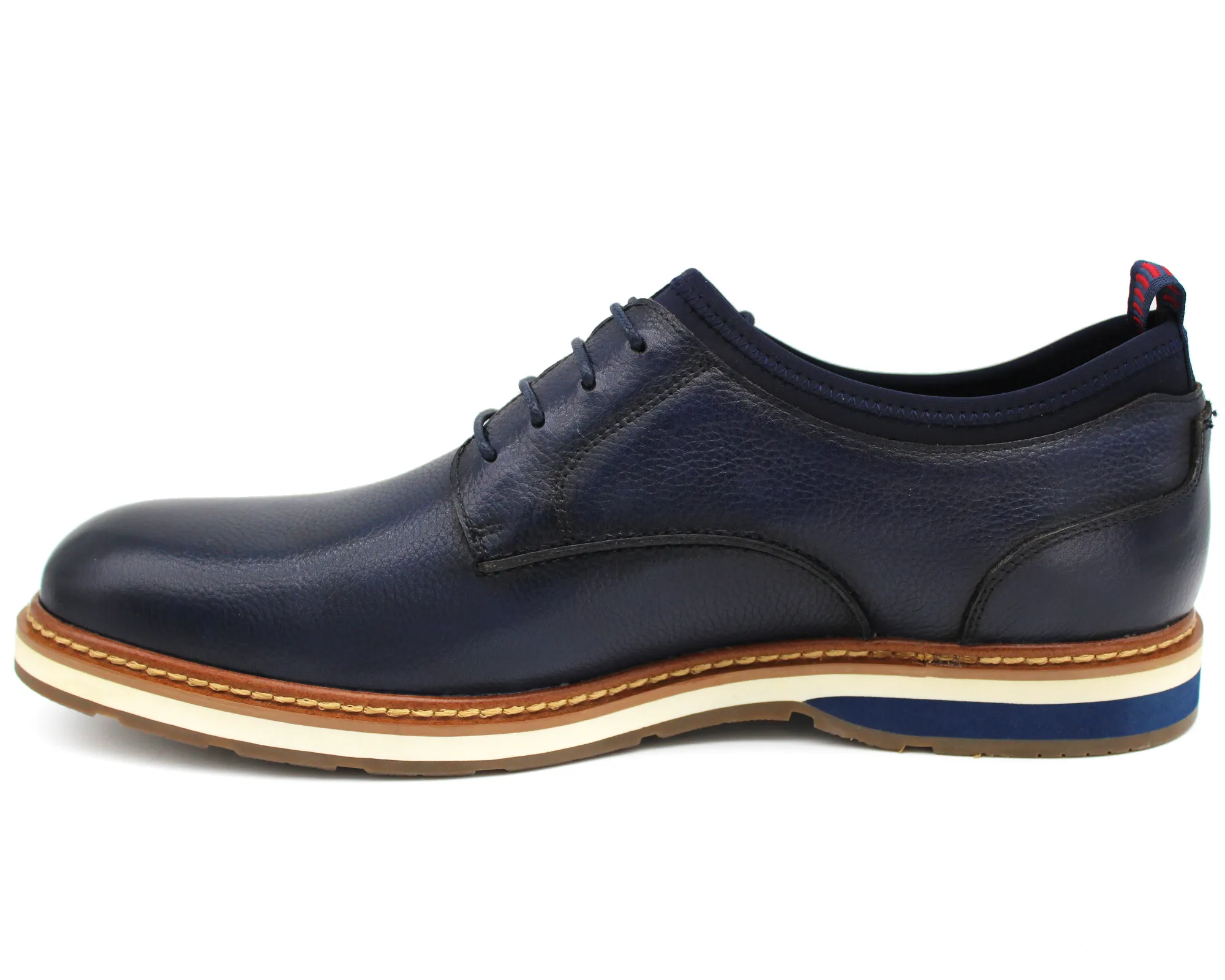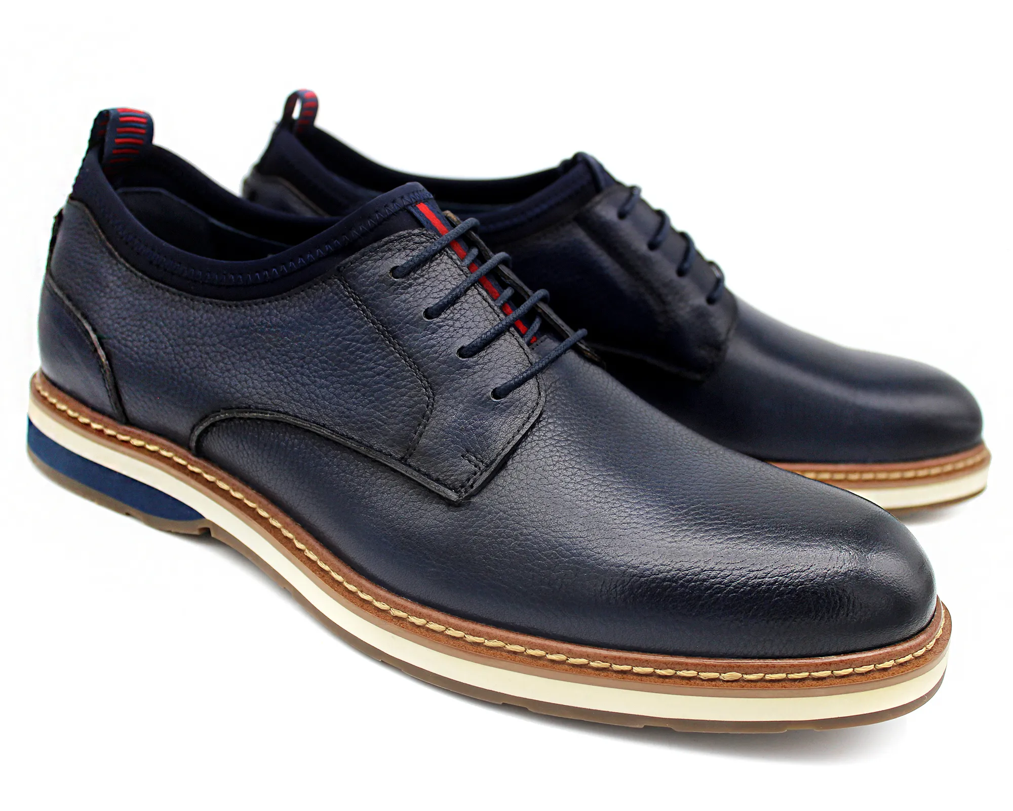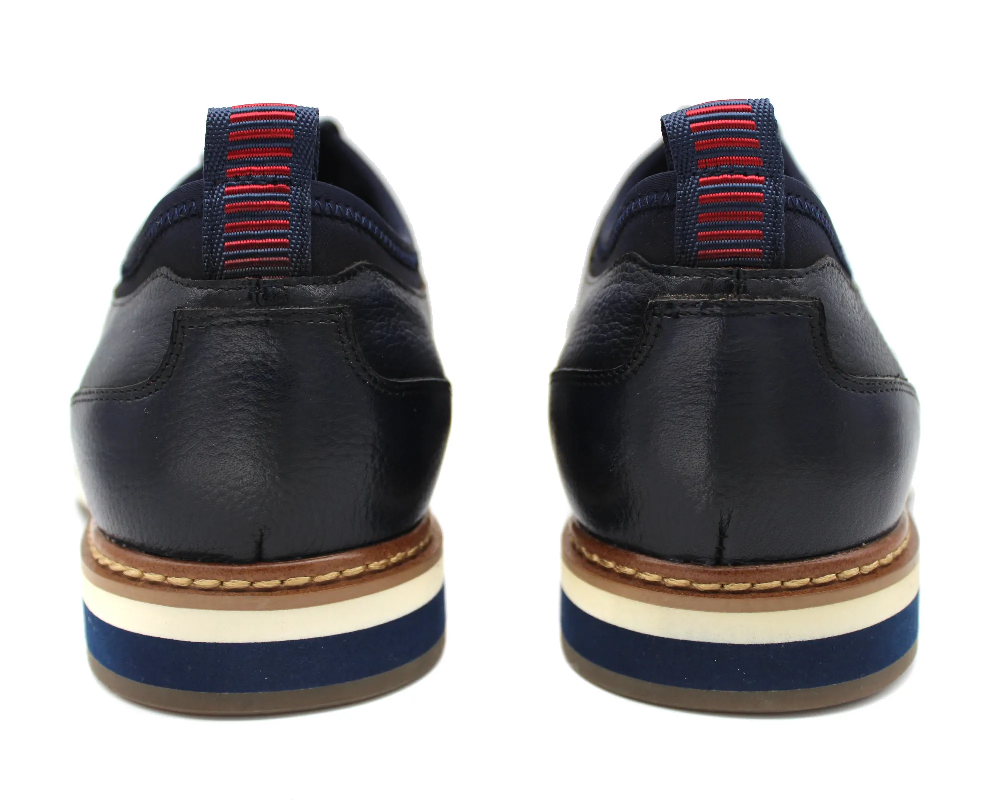 Navy smooth leather lace up semi sneakers with sock elastic trim. Genuine leather upper. Layered sole. Leather lining.